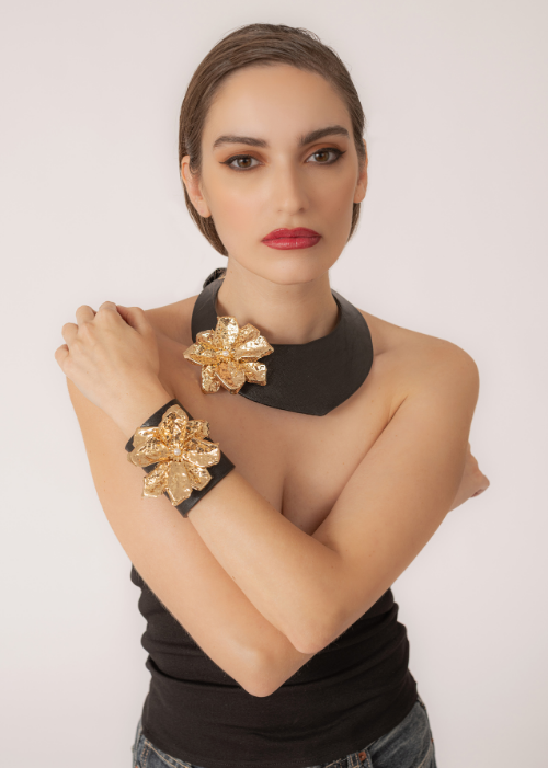I metalli vengono modellati e rifiniti in laboratorio, in abbinamento a pietre dure e dettagli come piume o elementi tessili.